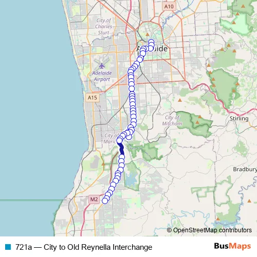 The first stop of the 721a bus route is Stop B1 King William St - East side and the last stop is Zone C Old Reynella Interchange. 721a (City to Old Reynella Interchange) is operational during los fines de semana.