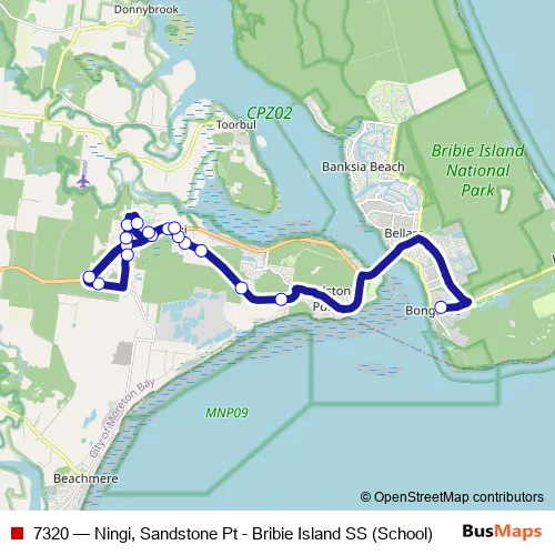 The first stop of the 7320 bus route is Bribie Island State School and the last stop is Bribie Island Rd at Bestmann Road. 7320 (Ningi, Sandstone Pt - Bribie Island SS (School)) is operational during entre semana.