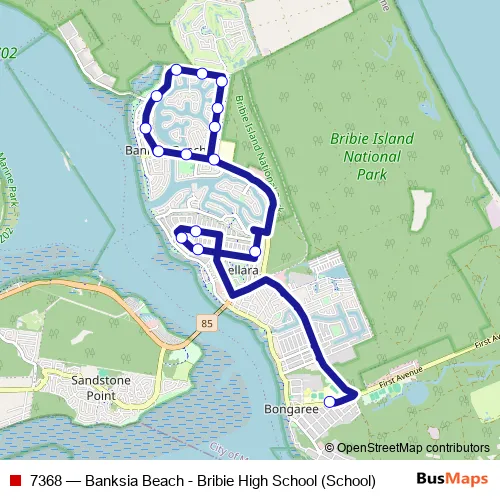 The first stop of the 7368 bus route is Bribie Island High School and the last stop is Sunderland Dr near Alpinia Ave. 7368 (Banksia Beach - Bribie High School (School)) is operational during entre semana.