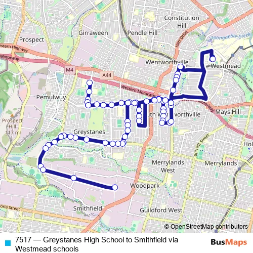 The first stop of the 7517 bus route is Greystanes High School Near Beresford Rd and the last stop is Percival Rd Before Cullen Pl. 7517 (Greystanes High School to Smithfield via Westmead schools) is operational during entre semana.
