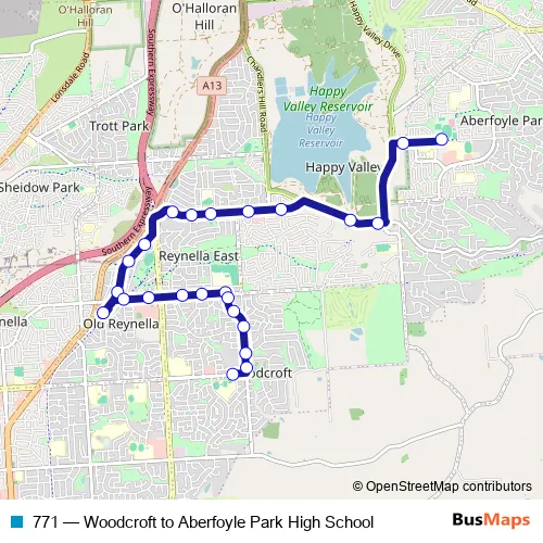 The first stop of the 771 bus route is Stop School Aberfoyle Park High Taylors Rd and the last stop is Stop 45 Pimpala Rd - South side. 771 (Woodcroft to Aberfoyle Park High School) is operational during entre semana.