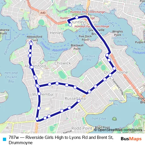 The first stop of the 787w bus route is Riverside Girls High School, Huntleys Point Rd, Stand 3 and the last stop is Lyons Rd At Mons St. 787w (Riverside Girls High to Lyons Rd and Brent St, Drummoyne) is operational during entre semana.