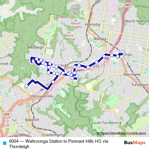 The first stop of the 8004 bus route is Illoura Av Opp Wahroonga Station and the last stop is Pennant Hills High School, Laurence St. 8004 (Wahroonga Station to Pennant Hills HS via Thornleigh) is operational during entre semana.
