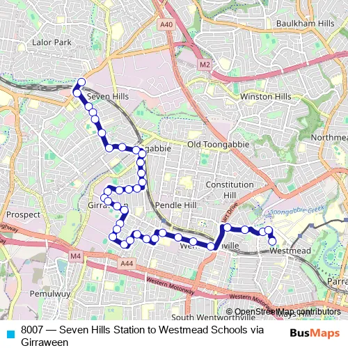 The first stop of the 8007 bus route is Seven Hills Station, Stand B and the last stop is Westmead Schools Bus Bay. 8007 (Seven Hills Station to Westmead Schools via Girraween) is operational during entre semana.