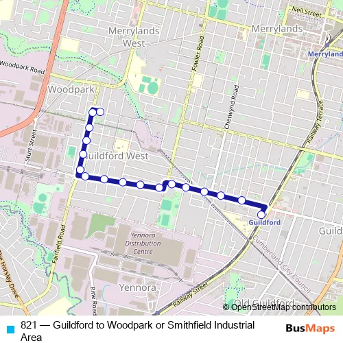 The first stop of the 821 bus route is Fairfield Rd Opp Sandra Street Park and the last stop is Guildford Station, Military Rd. 821 (Guildford to Woodpark or Smithfield Industrial Area) is operational during todos los días.