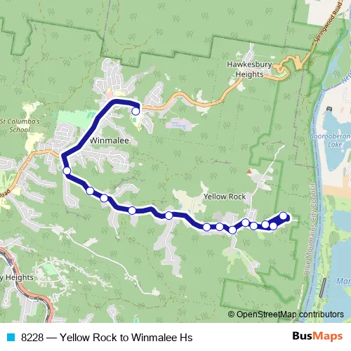 The first stop of the 8228 bus route is Cooroy Cres After Illingsworth Rd and the last stop is Winmalee Hs. 8228 (Yellow Rock to Winmalee Hs) is operational during entre semana.