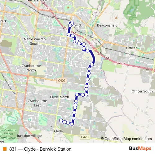 Services on the 831 - Clyde - Berwick Station bus stop at 23:10 on lunes, martes, miércoles, jueves, viernes, sábado, domingo.