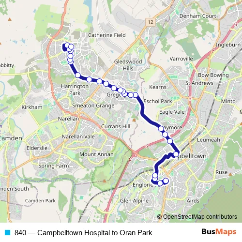 The first stop of the 840 bus route is Main Campbelltown Hospital and the last stop is Oran Park Town Centre, Oran Park Dr. 840 (Campbelltown Hospital to Oran Park) is operational during todos los días.