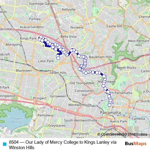 The first stop of the 8504 bus route is Parramatta Leagues Club, O'Connell St and the last stop is Seven Hills High School, Johnson Av. 8504 (Our Lady of Mercy College to Kings Lanley via Winston Hills) is operational during entre semana.