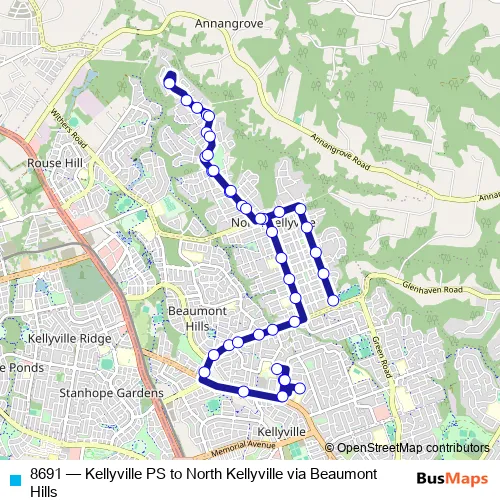 The first stop of the 8691 bus route is Kellyville Public School, Chalet Rd and the last stop is Foxall Rd Opp Australian International Academy. 8691 (Kellyville PS to North Kellyville via Beaumont Hills) is operational during entre semana.