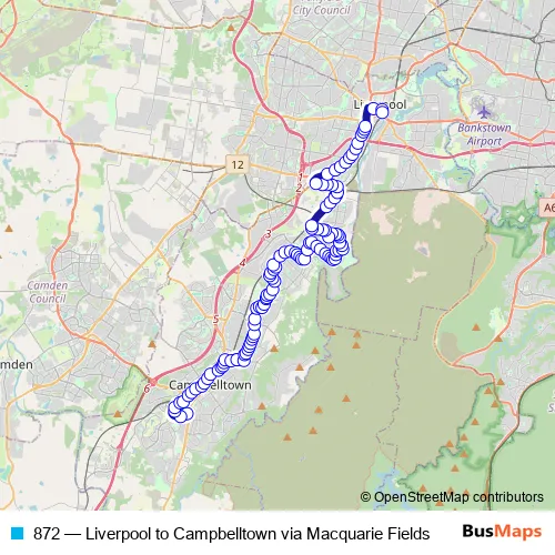 The first stop of the 872 bus route is Main Campbelltown Hospital and the last stop is Liverpool Station, Stand A. 872 (Liverpool to Campbelltown via Macquarie Fields) is operational during todos los días.