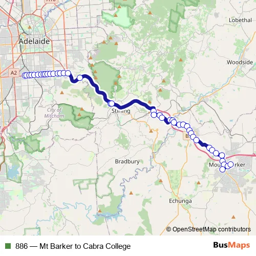 The first stop of the 886 bus route is Stop 176 Cross Rd - North side and the last stop is Zone A Dutton Rd Park 'n' Ride. 886 (Mt Barker to Cabra College) is operational during entre semana.