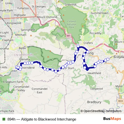The first stop of the 894h bus route is Stop 44 Mt Barker Rd - South side and the last stop is Zone B Blackwood Interchange. 894h (Aldgate to Blackwood Interchange) is operational during entre semana.