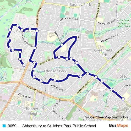 The first stop of the 9059 bus route is Bancroft Rd After Kingston Pl and the last stop is St Johns Park Public School, Edensor Rd. 9059 (Abbotsbury to St Johns Park Public School) is operational during entre semana.