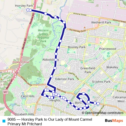 The first stop of the 9085 bus route is The Horsley Dr Opp Marion Primary School and the last stop is Our Lady Of Mt Carmel Primary School, Cabramatta Rd W. 9085 (Horsley Park to Our Lady of Mount Carmel Primary Mt Pritchard) is operational during entre semana.