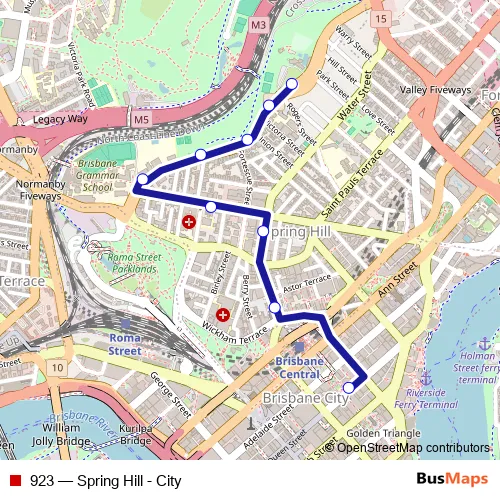 The first stop of the 923 bus route is Queen Street Stop 58 near Pedestrian Crossing and the last stop is Gregory Tce near Hill St, stop 8. 923 (Spring Hill - City) is operational during entre semana.