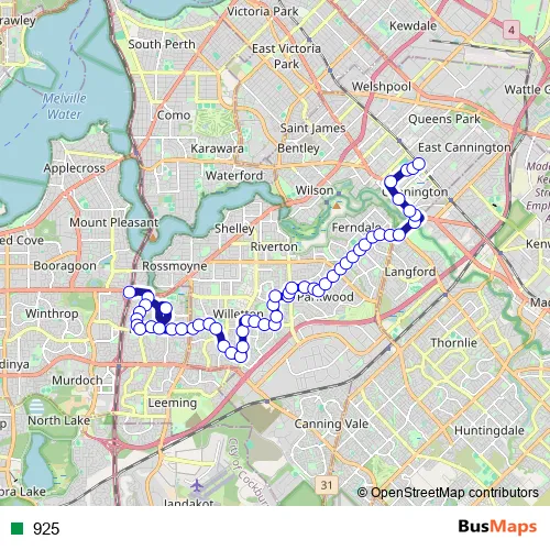 The first stop of the 925 bus route is Bull Creek Stn Stand 8 and the last stop is Cannington Stn Stand 15. 925 is operational during todos los días.