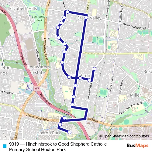 The first stop of the 9319 bus route is Whitford Rd Opp Robin St and the last stop is Good Shepherd Primary School, Twentieth Av. 9319 (Hinchinbrook to Good Shepherd Catholic Primary School Hoxton Park) is operational during entre semana.