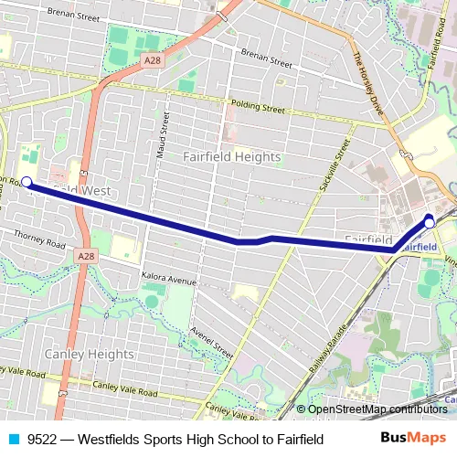 The first stop of the 9522 bus route is Westfields Sports High School, Bus Bay and the last stop is Fairfield Station, Stand F. 9522 (Westfields Sports High School to Fairfield) is operational during entre semana.