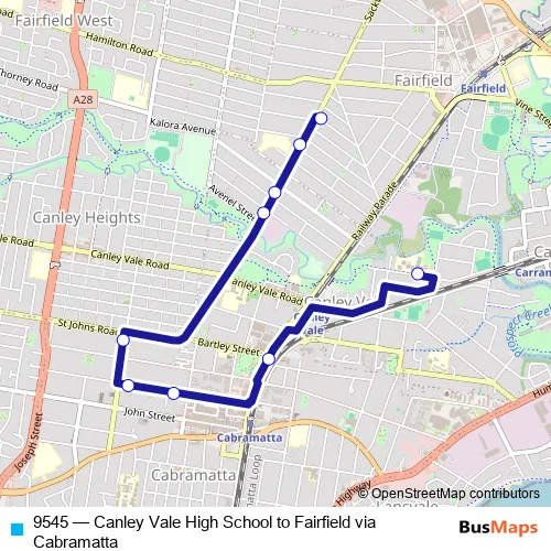 The first stop of the 9545 bus route is Canley Vale High School, Prospect Rd and the last stop is Avisford St At Sackville St. 9545 (Canley Vale High School to Fairfield via Cabramatta) is operational during entre semana.