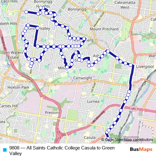 The first stop of the 9808 bus route is All Saints Senior College, School Grounds and the last stop is North Liverpool Rd Opp Purley Cl. 9808 (All Saints Catholic College Casula to Green Valley) is operational during entre semana.
