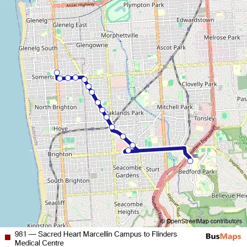 The first stop of the 981 bus route is Stop School Brighton Rd / Elgar Rd and the last stop is Zone B Flinders Medical Centre. 981 (Sacred Heart Marcellin Campus to Flinders Medical Centre) is operational during entre semana.