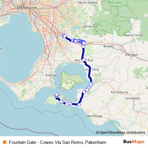 Additional information: Fountain Gate - Cowes Via San Remo, Pakenham has 38 stops and the total trip duration for this route is approximately 90 minutes.