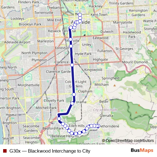 The first stop of the G30x bus route is Zone C Blackwood Interchange and the last stop is Stop Y2 King William St - West side. G30x (Blackwood Interchange to City) is operational during entre semana.