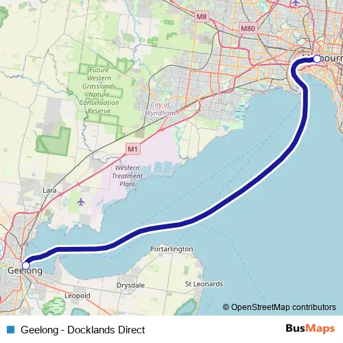 Additional information: Geelong - Docklands Direct has 2 stops and the total trip duration for this route is approximately 95 minutes.