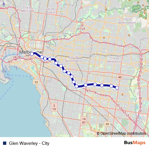 See why over 2 million users trust and consider busmaps.com as the best public transport website. busmaps gives you Melbourne Metro Lines suggested routes, real-time bus tracker, line route maps in Melbourne, and helps to find the closest Glen Waverley - City metro stops near you. No internet available? Download an offline PDF map and bus schedule for the Glen Waverley - City metro to take on your trip.