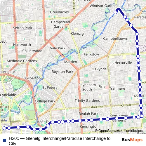The first stop of the H20c bus route is Zone I Paradise Interchange - North West side and the last stop is Stop W1 Currie St - South side. H20c (Glenelg Interchange/Paradise Interchange to City) is operational during entre semana.