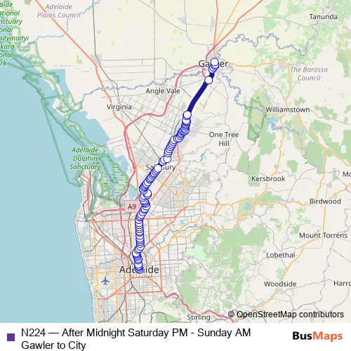 The first stop of the N224 bus route is Stop VS3 Victoria Sq - East side and the last stop is Stop 101 Cowan St - South side. N224 (After Midnight Saturday PM - Sunday AM Gawler to City) is operational during los fines de semana.