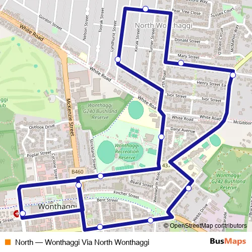 The first stop of the North bus route is Wonthaggi Bus Interchange/Biggs Dr and the last stop is Wonthaggi Bus Interchange/Biggs Dr. North (Wonthaggi Via North Wonthaggi) is operational during entre semana.