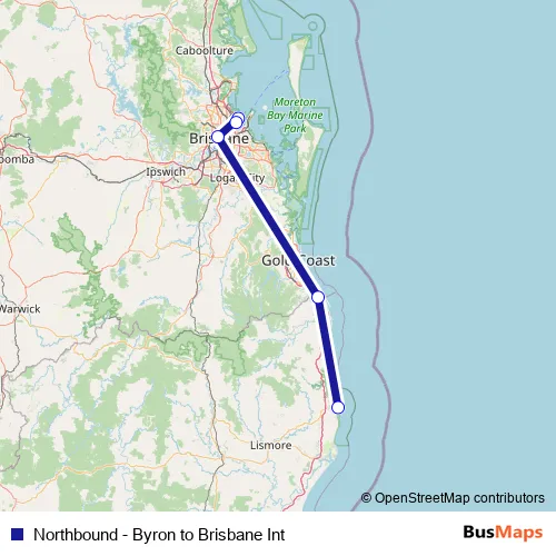 Northbound - Byron to Brisbane Int bus Route Map