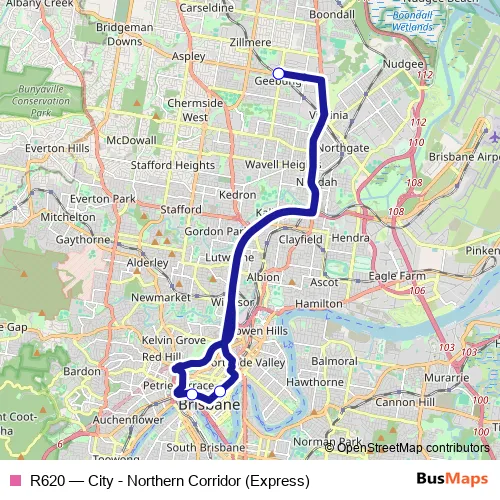 The first stop of the R620 bus route is Geebung station - Fossil St and the last stop is Geebung station - Fossil St. R620 (City - Northern Corridor (Express)) is operational during todos los días.