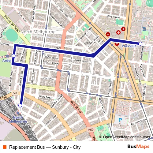 The first stop of the Replacement Bus metro route is North Melbourne Rail Replacement Bus Stop and the last stop is North Melbourne Rail Replacement Bus Stop. Replacement Bus (Sunbury - City) is operational during todos los días.