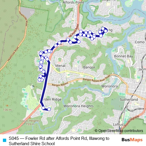 The first stop of the S045 bus route is Sir Thomas Mitchell Residential Care Facility, Fowler Rd and the last stop is Shire Christian School, School Grounds, Allies Rd. S045 (Fowler Rd after Alfords Point Rd, Illawong to Sutherland Shire School) is operational during entre semana.