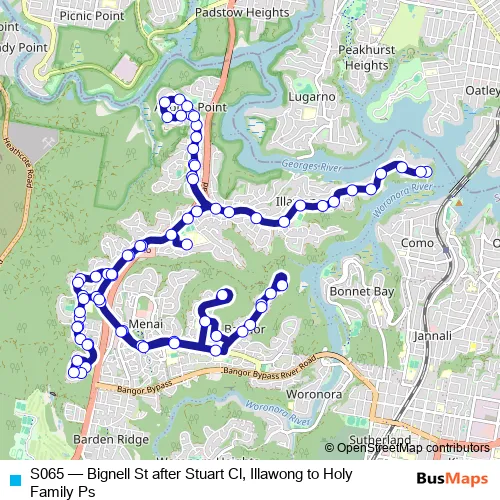 The first stop of the S065 bus route is Bill Wakeham Reserve, Bignell St and the last stop is Menai High School, Gerald Rd. S065 (Bignell St after Stuart Cl, Illawong to Holy Family Ps) is operational during entre semana.
