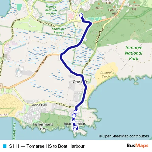The first stop of the S111 bus route is Tomaree Education Centre, Bays 1-3 and the last stop is Blanch St Before Castaway Cl. S111 (Tomaree HS to Boat Harbour) is operational during entre semana.