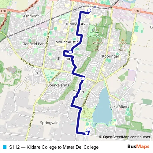 The first stop of the S112 bus route is Edmondson St Opp Kildare Catholic College and the last stop is Mater Dei Catholic College. S112 (Kildare College to Mater Dei College) is operational during entre semana.