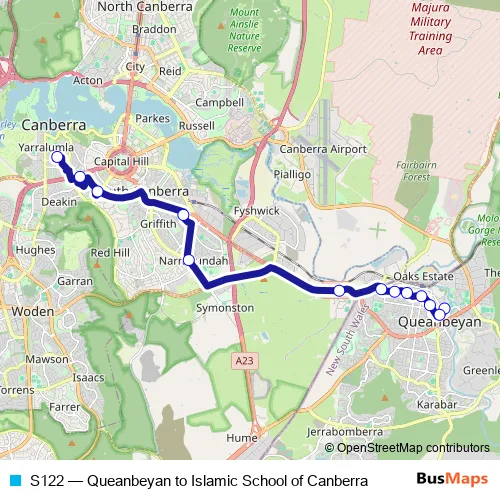 The first stop of the S122 bus route is Queanbeyan Interchange, Stand 3 and the last stop is Yarralumla Primary School, Loftus St. S122 (Queanbeyan to Islamic School of Canberra) is operational during entre semana.