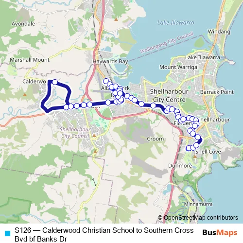 The first stop of the S126 bus route is St Paul's Catholic Primary School, Tongarra Rd and the last stop is Southern Cross Bvd After Banks Dr. S126 (Calderwood Christian School to Southern Cross Bvd bf Banks Dr) is operational during entre semana.