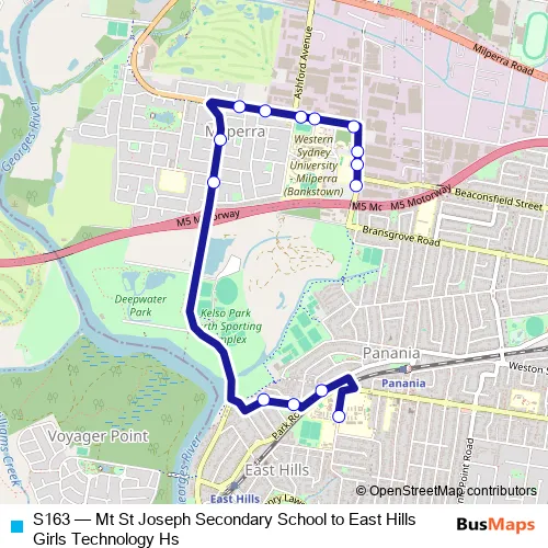 The first stop of the S163 bus route is Horsley Rd Opp Beaconsfield St and the last stop is East Hills Boys High School, Lucas Rd. S163 (Mt St Joseph Secondary School to East Hills Girls Technology Hs) is operational during entre semana.
