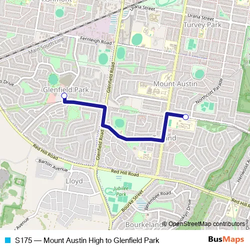 The first stop of the S175 bus route is Mount Austin High School, Leavenworth Dr and the last stop is South City Shopping Centre, Pinaroo Dr. S175 (Mount Austin High to Glenfield Park) is operational during entre semana.