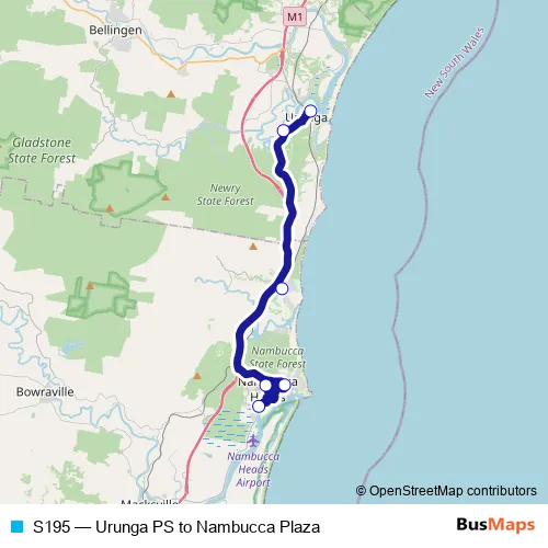 The first stop of the S195 bus route is Urunga Public School, Orara St and the last stop is Nambucca Plaza. S195 (Urunga PS to Nambucca Plaza) is operational during entre semana.