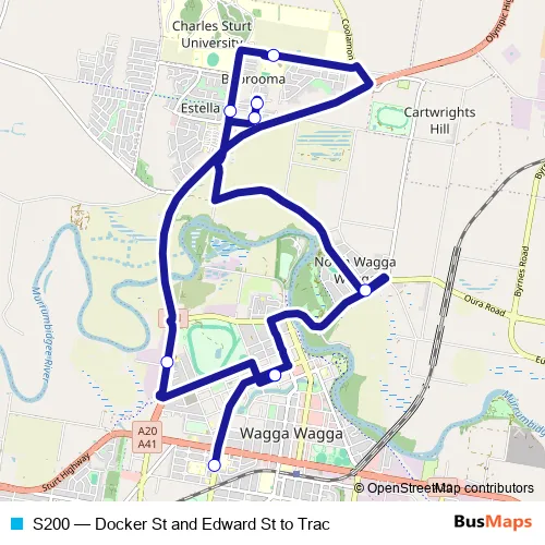 The first stop of the S200 bus route is Docker St At Hardy St and the last stop is Wagga Wagga Public School, Simmons St, Stand B. S200 (Docker St and Edward St to Trac) is operational during entre semana.