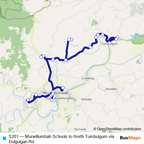 The first stop of the S201 bus route is Dulguigan Rd At Boyds Lane and the last stop is Tweed Valley Adventist College. S201 (Murwillumbah Schools to North Tumbulgum via Dulguigan Rd) is operational during entre semana.