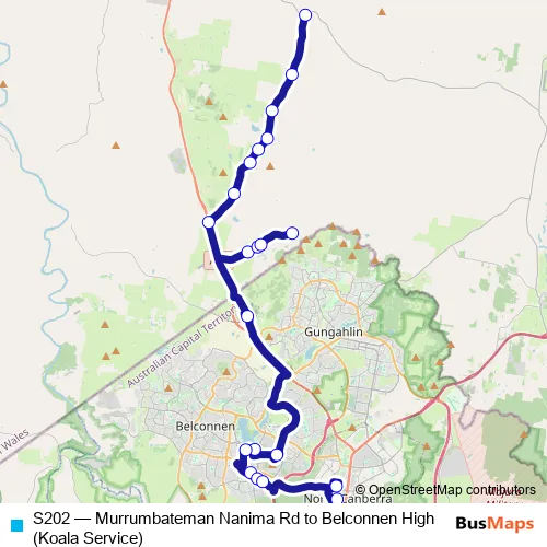 The first stop of the S202 bus route is Nanima Rd After Murrumbateman Rd and the last stop is Turner Ps. S202 (Murrumbateman Nanima Rd to Belconnen High (Koala Service)) is operational during entre semana.