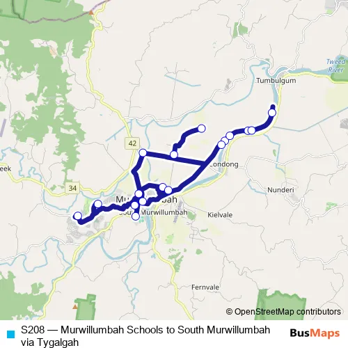 The first stop of the S208 bus route is Murwillumbah Public School, Riverview St and the last stop is Brisbane St Opp Sunnyside Mall. S208 (Murwillumbah Schools to South Murwillumbah via Tygalgah) is operational during entre semana.
