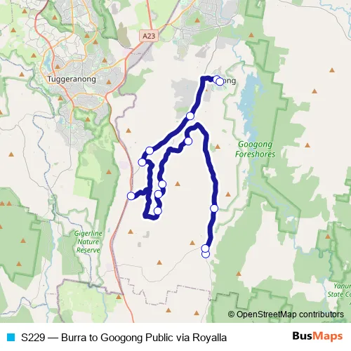 Bus S229 - Burra to Googong Public via Royalla in Canberra: Stops & Timetable